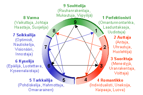 Tunnekeskukseen kuuluvat kakkonen (auttaja), kolmonen (suorittaja) ja nelonen (romantikko).